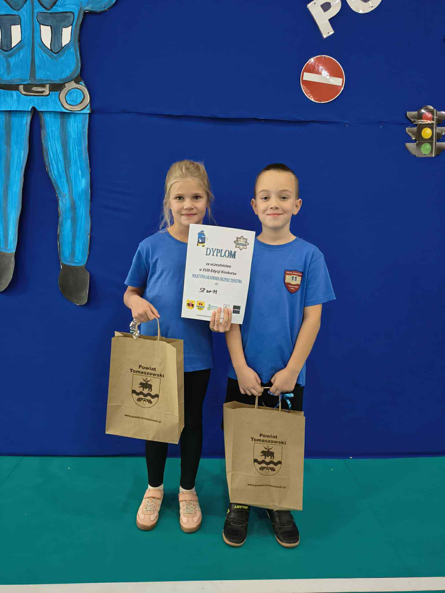 Uczniowie klasy 2c wzięli udział w powiatowym konkursie „Policyjna Akademia Bezpieczeństwa”, którego celem było promowanie zasad bezpiecznego zachowania w różnych sytuacjach. Dzieci wykazały się dużą wiedzą i zaangażowaniem – świetnie poradziły sobie zarówno z testem wiedzy, jak i z torem przeszkód, pokazując sprawność fizyczną, współpracę i doskonałe przygotowanie. Za swoje osiągnięcia otrzymali nagrody, które były miłym zwieńczeniem ich wysiłku.