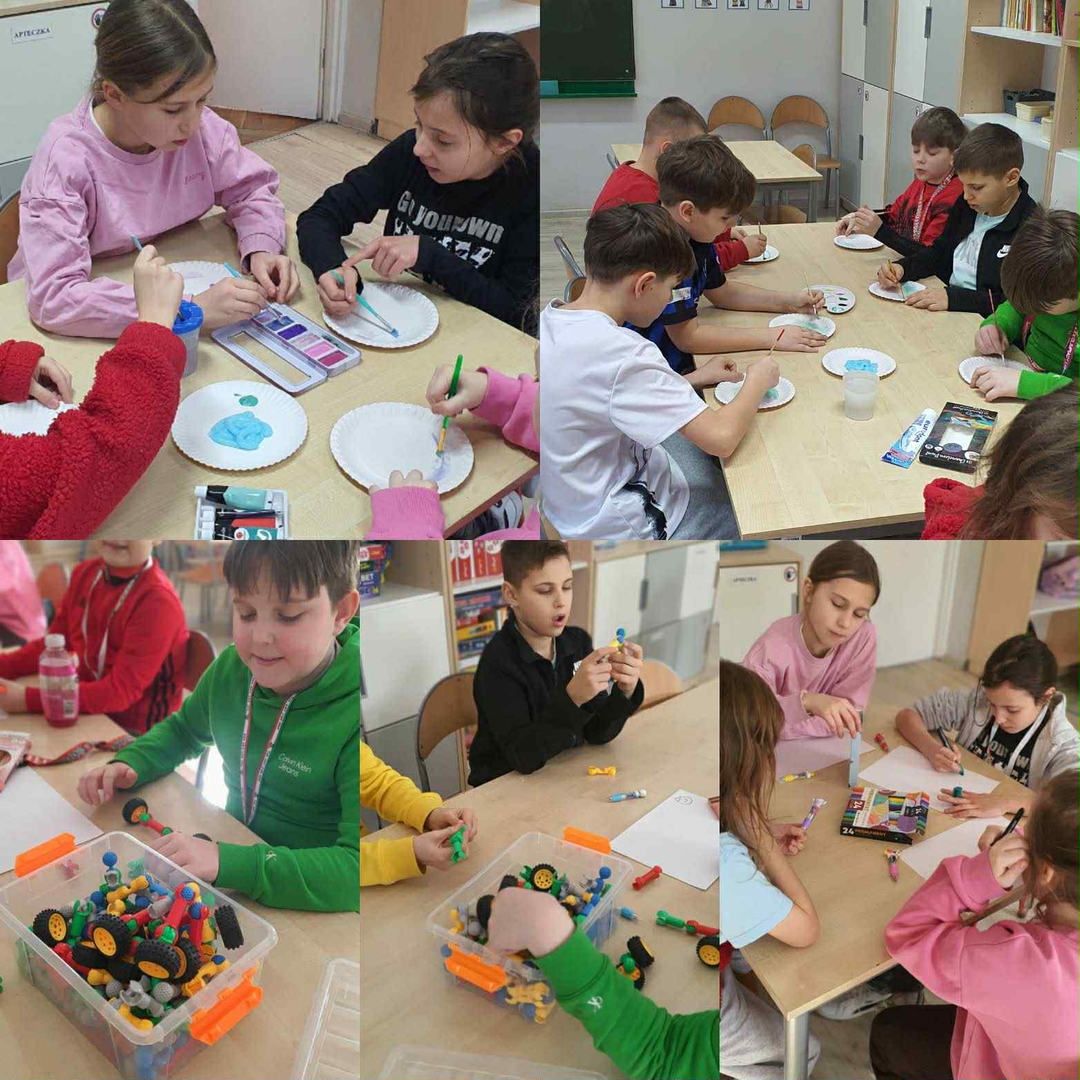 Nie zabrakło zajęć profilaktycznych i sensorycznych, gier planszowych oraz zabaw sportowych. Podczas warsztatów pizzy w pizzeri Capone, mali kucharze poznali kulinarne sekrety, a relaksacyjne ćwiczenia i spacery na świeżym powietrzu dopełniały aktywne dni Uczestnicy odwiedzili kino Helios, wybrali się na pełną wrażeń wycieczkę do Mandorii, wzięli udział w zajęciach bibliotecznych „Bajanie na szklanym ekranie” w Miejskiej Bibliotece Publicznej oraz rozwijali kreatywność podczas „Zimowych prac plastycznych”. Uczniowie uczestniczyli także w zajęciach i eksperymentach w Bibliotece Pedagogicznej oraz warsztatach muzycznych w Kocie w Nutach. Śnieżna pogoda zachęcała do białego szaleństwa. Kulig połączony z ogniskiem i pieczeniem kiełbasek dostarczył dzieciom niezapomnianych wrażeń. Był też czas na bitwę na śnieżki. Czwartkowe i piątkowe wyjście na kręgielnię uczyło zasad gry zespołowej, postępowania fairplay i sportowej rywalizacji. To były po prostu FERIE NA MEDAL.